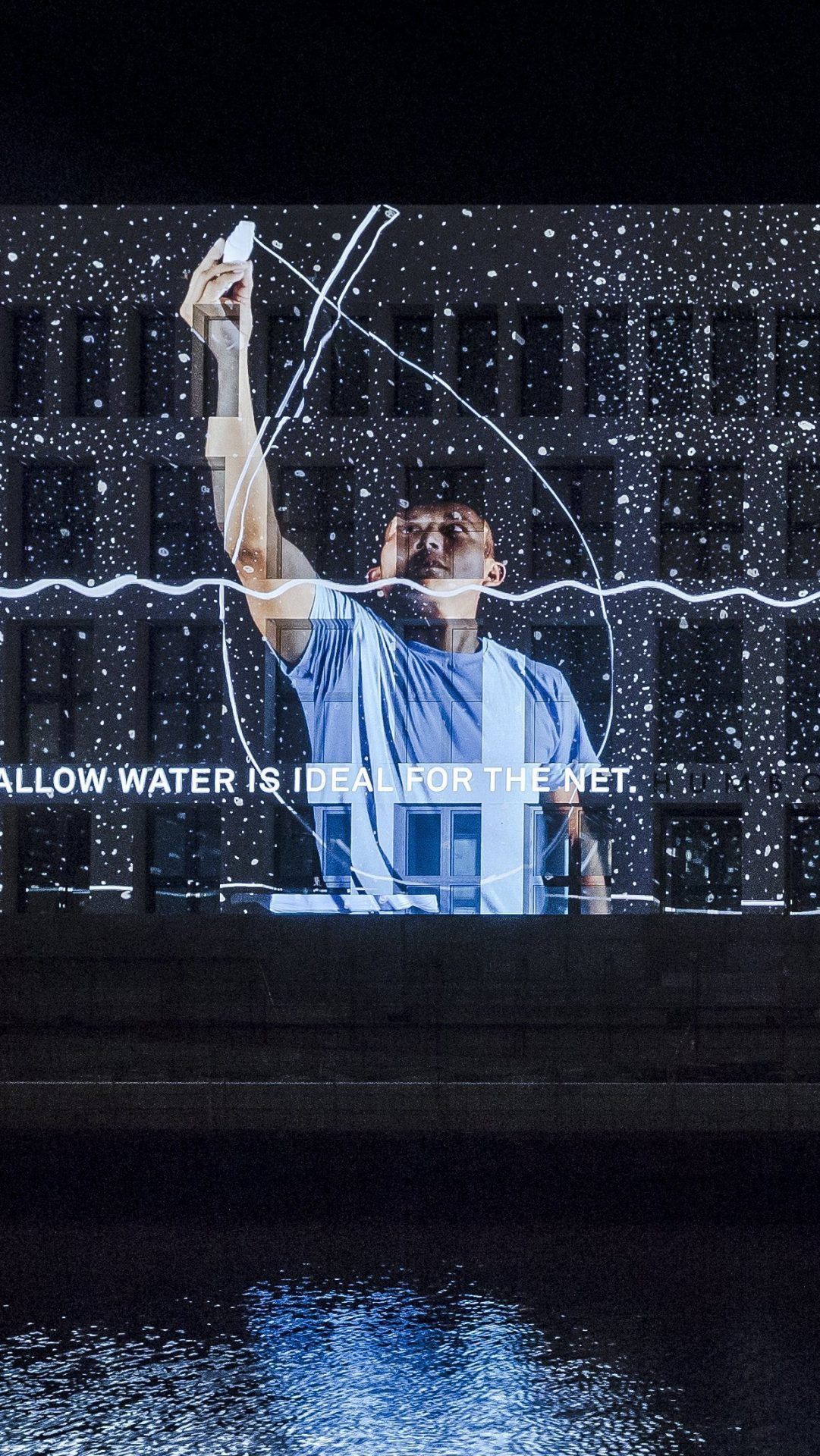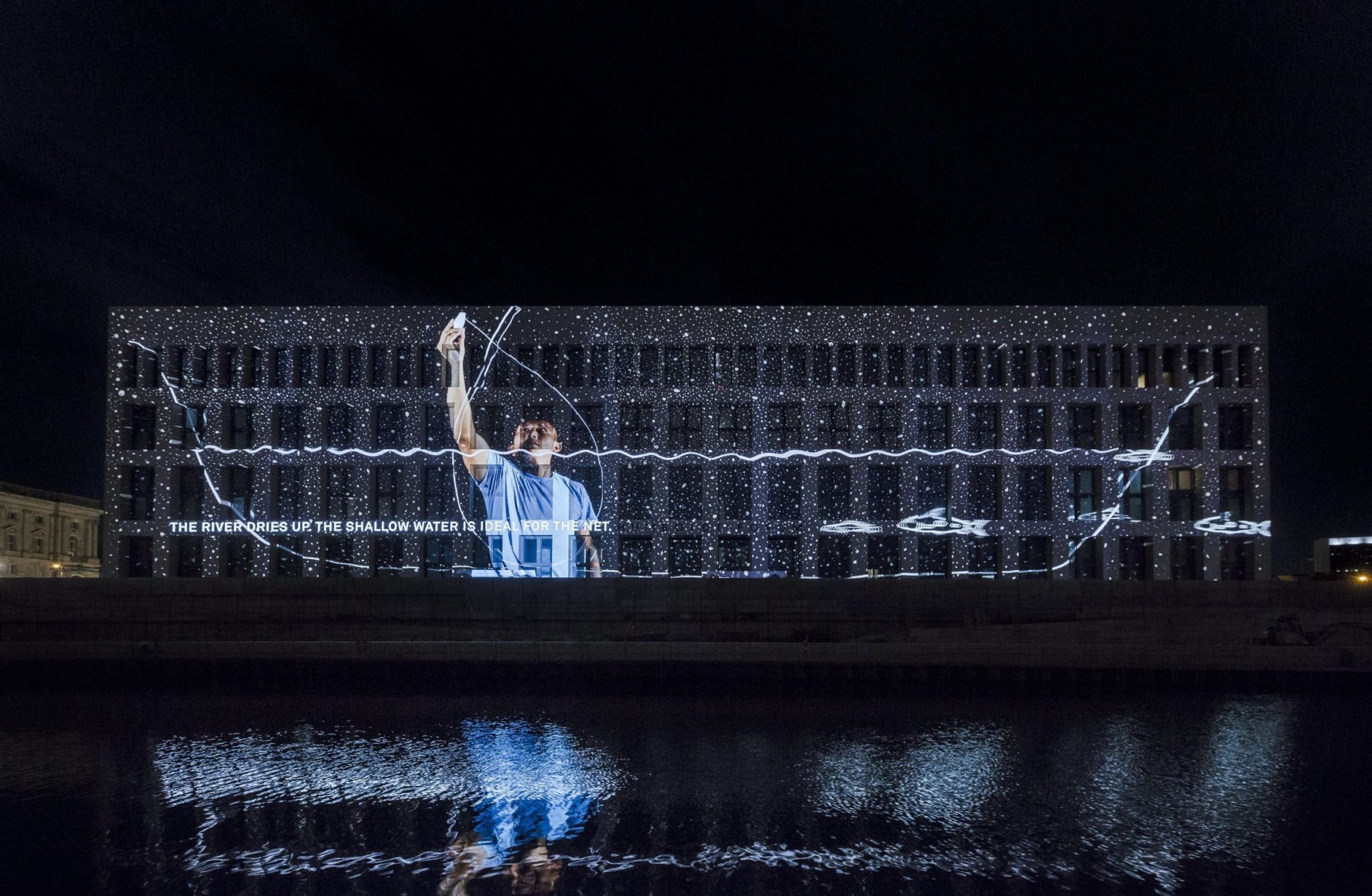 Lichtprojektion an der Ostfassade des Humboldt Forums, September 2019.