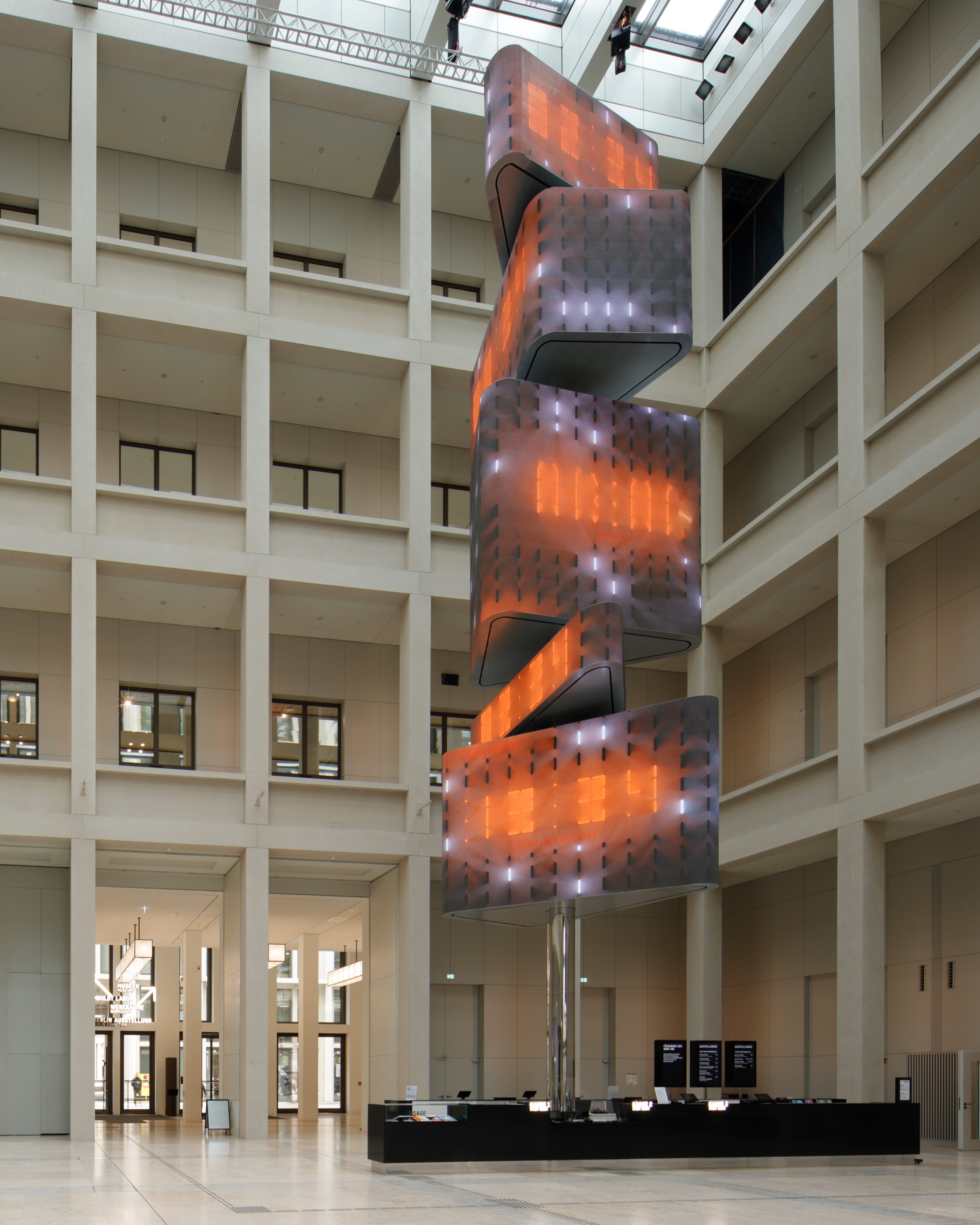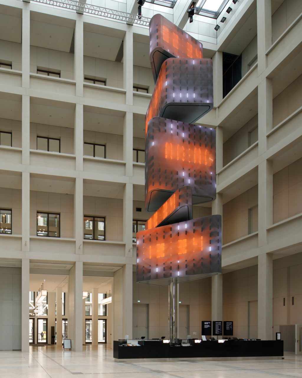 Dieses zentrale Element unseres Leit-, Orientierungs- und Informationssystems begrüßt alle Besucher*innen mit einer Symbiose aus künstlerischer Ästhetik und informativen Inhalten. Durch eine kreative Inszenierung werden die Identität und die vielfältigen Inhalte des Humboldt Forums auf eindrucksvolle Weise zum Ausdruck gebracht.