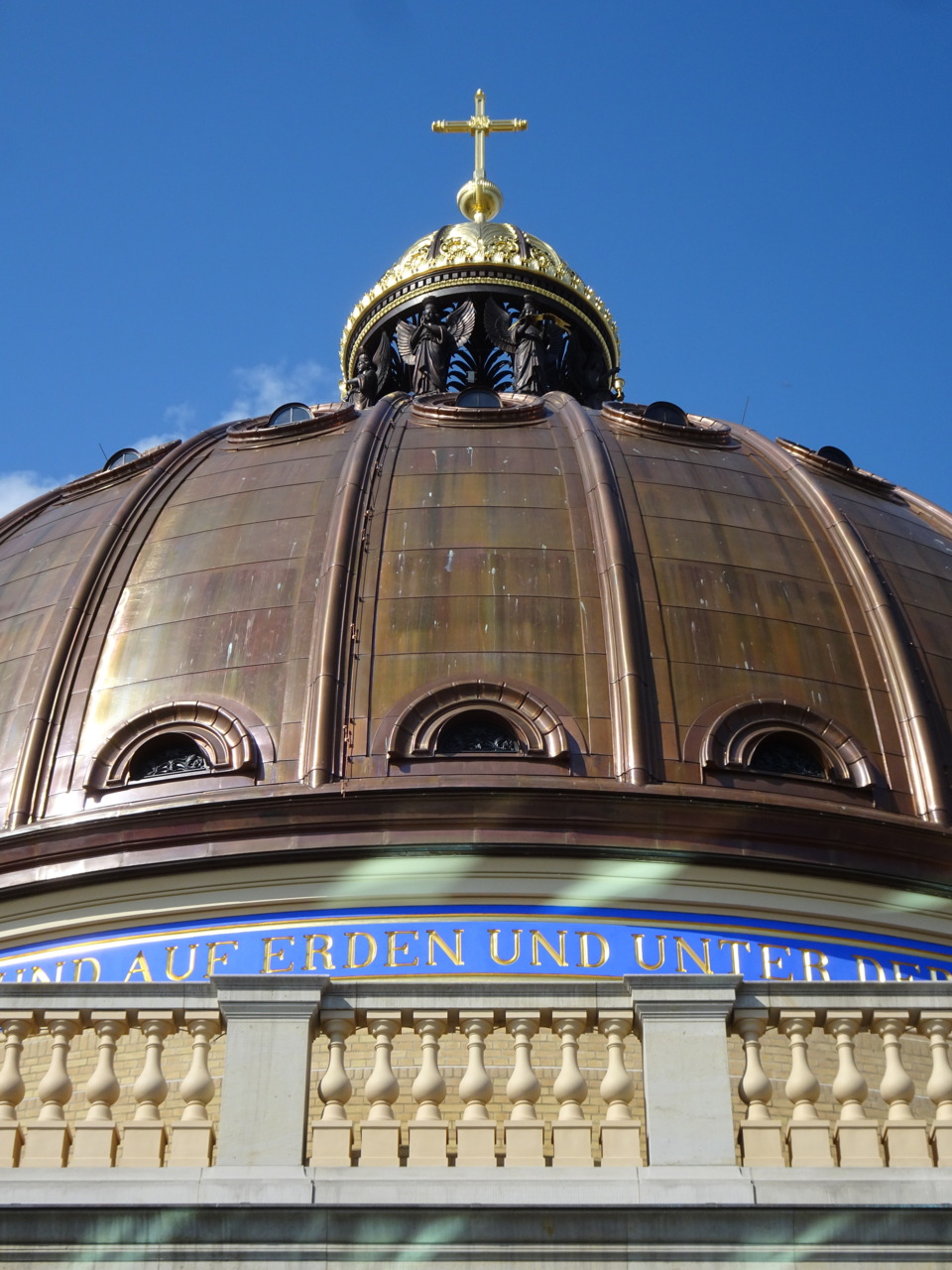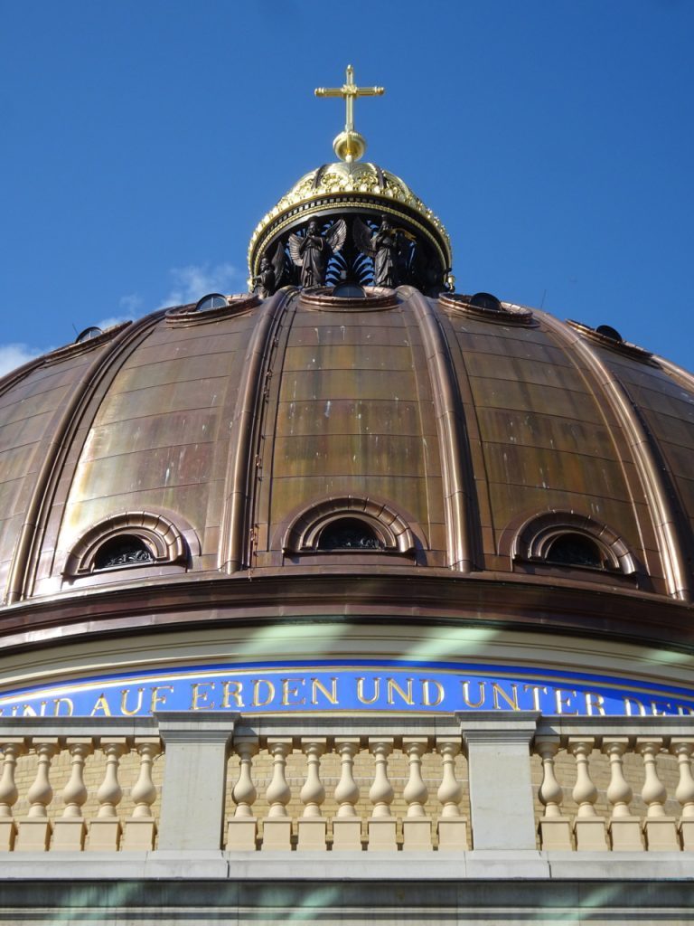 Das stimmt zwar. Aber eine Kuppel gehörte zur barocken Planungsphase um 1700 sehr wohl. Aber der Soldatenkönig hatte diese Kuppel als Geldverschwendung gestrichen. Die Entwürfe von Friedrich Wilhelm IV. haben teils an Eosanders Entwurf angeknüpft. Oben auf der Kuppel von Eosanders „Neuem Münzturm“ befand sich eine Krone und über dieser: ein Reichsapfel – mit Kreuz!