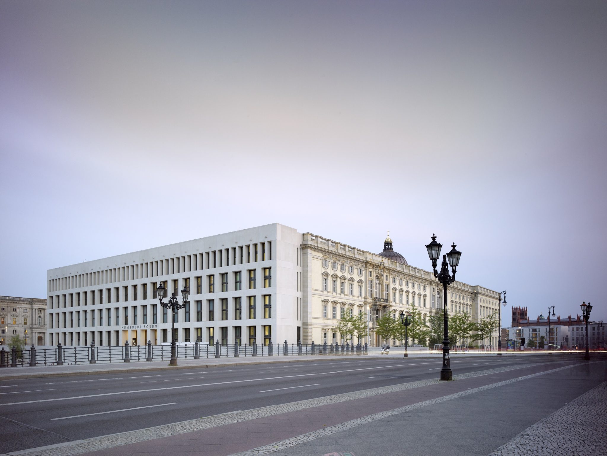 Ost- und Nordfassade des Humboldt Forums im Abendlicht
