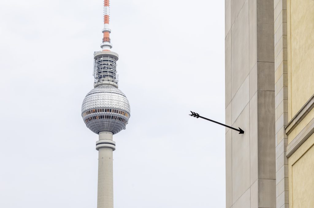 Seit heute markiert das fast vier Meter lange bronzefarbene Kunstwerk Südpfeil des Berliner Künstlers und Architekten Jürgen Mayer H. die Außenfassade am Nordgiebel des Humboldt Forums. Inspiriert von den „Pfeilstörchen“ – jenen Zugvögeln, die mit afrikanischen Pfeilen im Gefieder erstmals globale Migrationswege sichtbar machten –, greift die Arbeit kulturelle und koloniale Bezüge auf. Mit der Intervention wurde das achte und letzte Kunst-am-Bau-Werk für das Humboldt Forum realisiert.