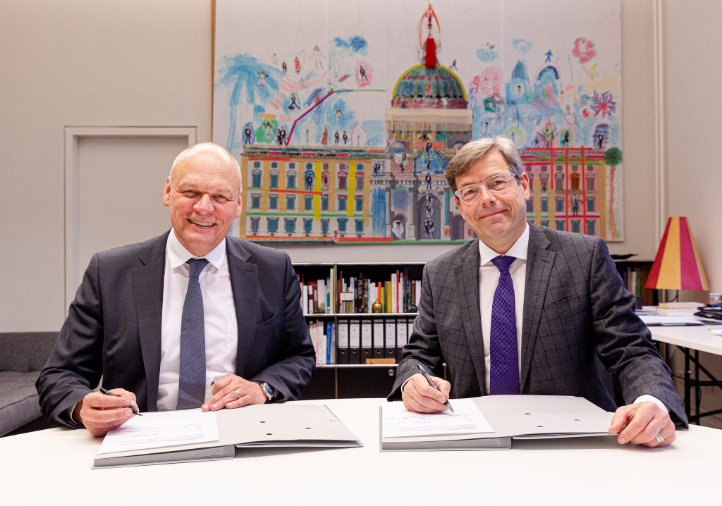 Johannes Ebert, Generalsekretär des Goethe-Instituts und Hartmut Dorgerloh, Generalintendant des Humboldt Forums unterzeichnen „Memorandum of Understanding"