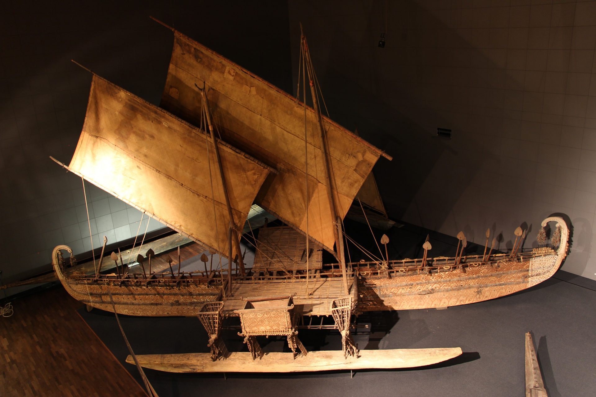 Luf-Boot in Dahlem. Hochsee-Segelboot mit Ausleger (Ident.Nr. VI 23116 a), 19. Jh., aus Para-Mikronesien: Bismarck-Archipel, Westliche-Inseln, Luf (auch: Hermit-Inseln, Agomes, Eremiteninseln) (Inselgruppe). Holz, geschnitzt, rot, weiß und schwarz bemalt, Bindungen aus Rotan und Kokosfaserschnur, pflanzliche Kittmasse, Bambus, Pflanzenfaser, Federn, Textil, Segel aus Palmblattstreifen geflochten