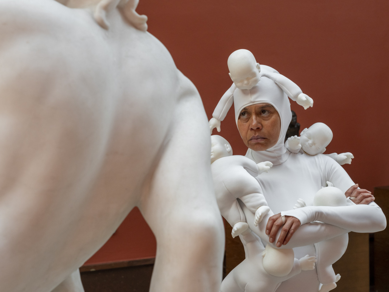 Im Humboldt Forum, umgeben von den Blicken der Ahnengalerie der Kurfürsten und der unlängst mit KI dazu generierten Kurfürstinnen im 3. Obergeschoss, entfaltet die auf den Philippinen geborene und in Dänemark lebende Lilibeth Cuenca Rasmussen ihre Performance über Mutterschaft, Wahlfreiheit sowie die körperliche und emotionale Auseinandersetzung mit Babys und Kindern. In einem weißen, skulpturalen Kostüm – inspiriert von Kai Nielsens Skulptur “Mother of Water” und überwachsen mit Babyfiguren – begleitet von Vojta Drnek’s Akkordeon sowie Text und interaktiven Momenten, zeigt sie, wie Kinder den Körper der Mutter beanspruchen, fordern und formen – und wie sich darin Ambivalenz, Erschöpfung, Nähe und Selbstbestimmung verweben.