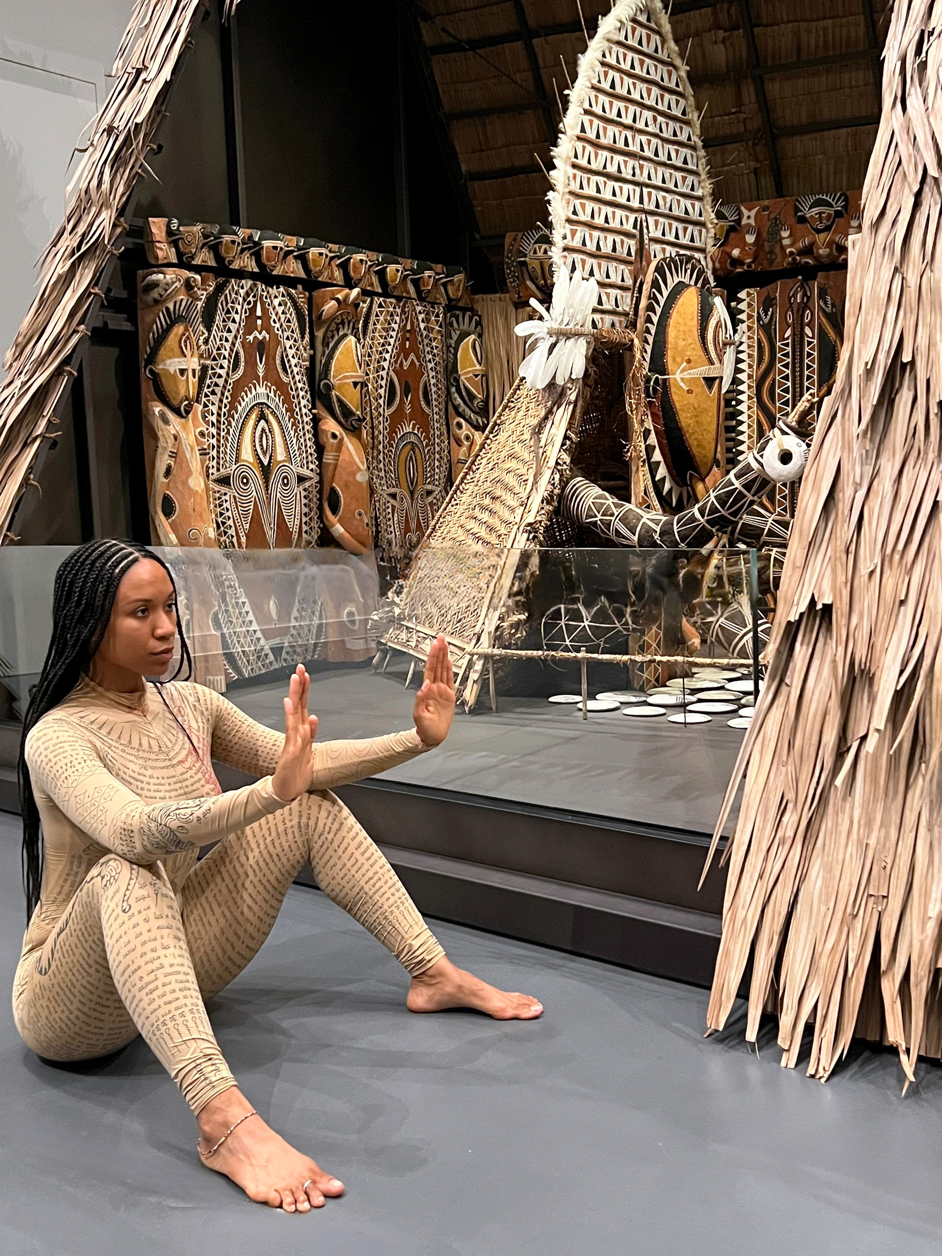 Station 3: Ozeanien (Initiationshaus aus Abelam in Papua New Guinea) – „Übergänge spürbar machen. Der Weg vom Kind zum Erwachsenen wird rituell erfahrbar, der animierte Körper umarmt den Wandel.“ Kristy Nataraja