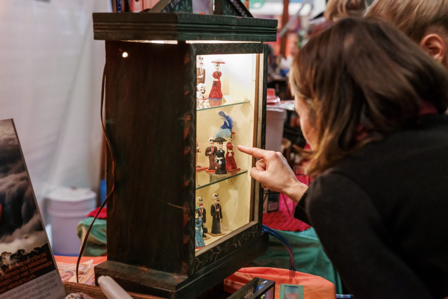 Die typischen mexikanischen Miniaturen zum Totenfest sind Kunsthandwerk und Lehrstück zugleich, denn sie halten uns den Spiegel vor. Die Künstler*innen zeigen winzige Skelette auf dem Zahnarztstuhl, vor dem Traualtar, als Fahrradfahrer oder in der Bibliothek beim Lesen eines Buches. In den unterschiedlichen Alltagssituationen wird deutlich, dass der Tod mitten im Leben präsent ist und uns überall einholen kann. Eine Sammlung von Calaca e.V. – bunt, originell und witzig