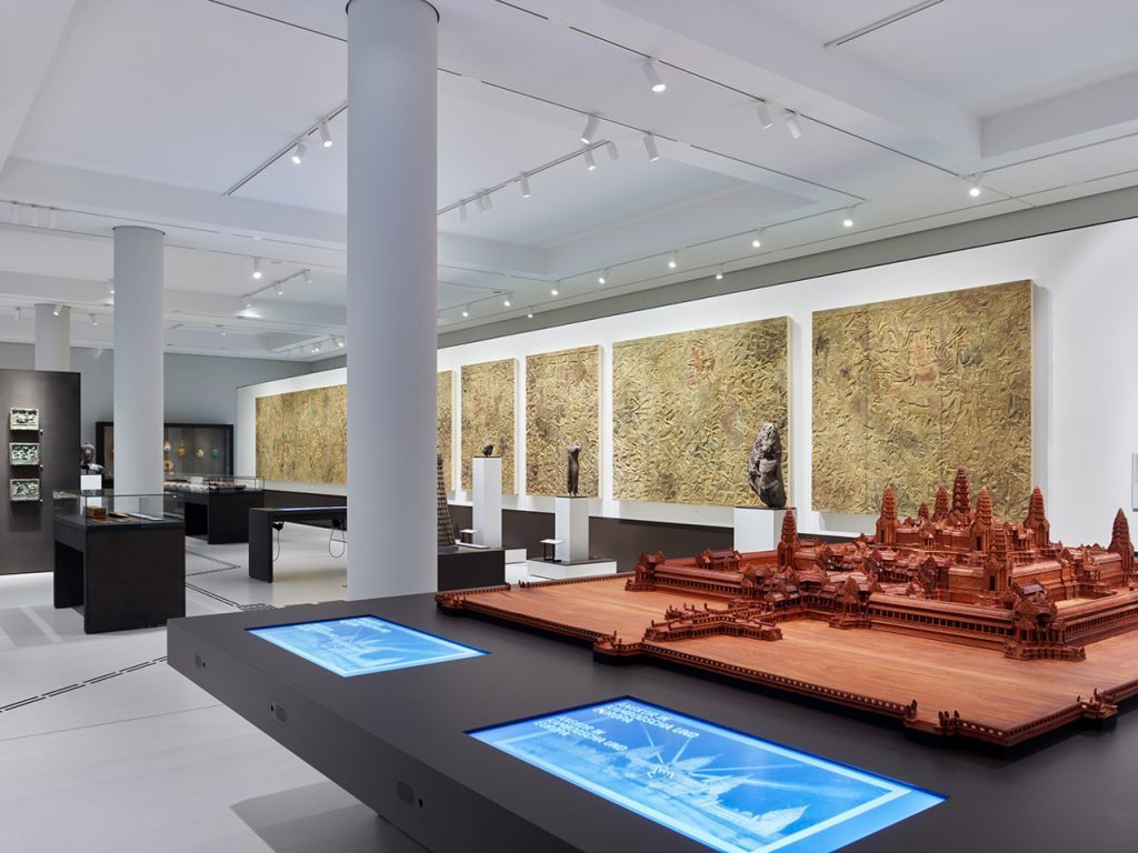 Angkor Wat in Cambodia is one of the largest sacred structures in the world. The temple complex is considered an expression in stone of the Khmer Empire’s Hindu-influenced divine kingship. However, at the end of the twelfth century the last great king of Angkor adopted Mahayana Buddhism as state religion and had the city of Angkor Thom with the famous Bayon temple built. On the third floor of the Humboldt Forum, painstakingly restored casts of Angkor Wat reliefs extending two times twenty-three metres across the space give visitors a sense of the monumental temple architecture of the World Heritage site. A model of Angkor Wat in reddish-coloured tropical wood, which was made on a scale of 1:50 by Cambodian craftsmen in 2007 for the exhibition “Angkor. Divine heritage of Cambodia” and then slumbered in the storage room of the Ethnologisches Museum in Berlin for ten years, gives an additional impression of the monumentality of the complex with its central temple towers and surrounding extended colonnades.