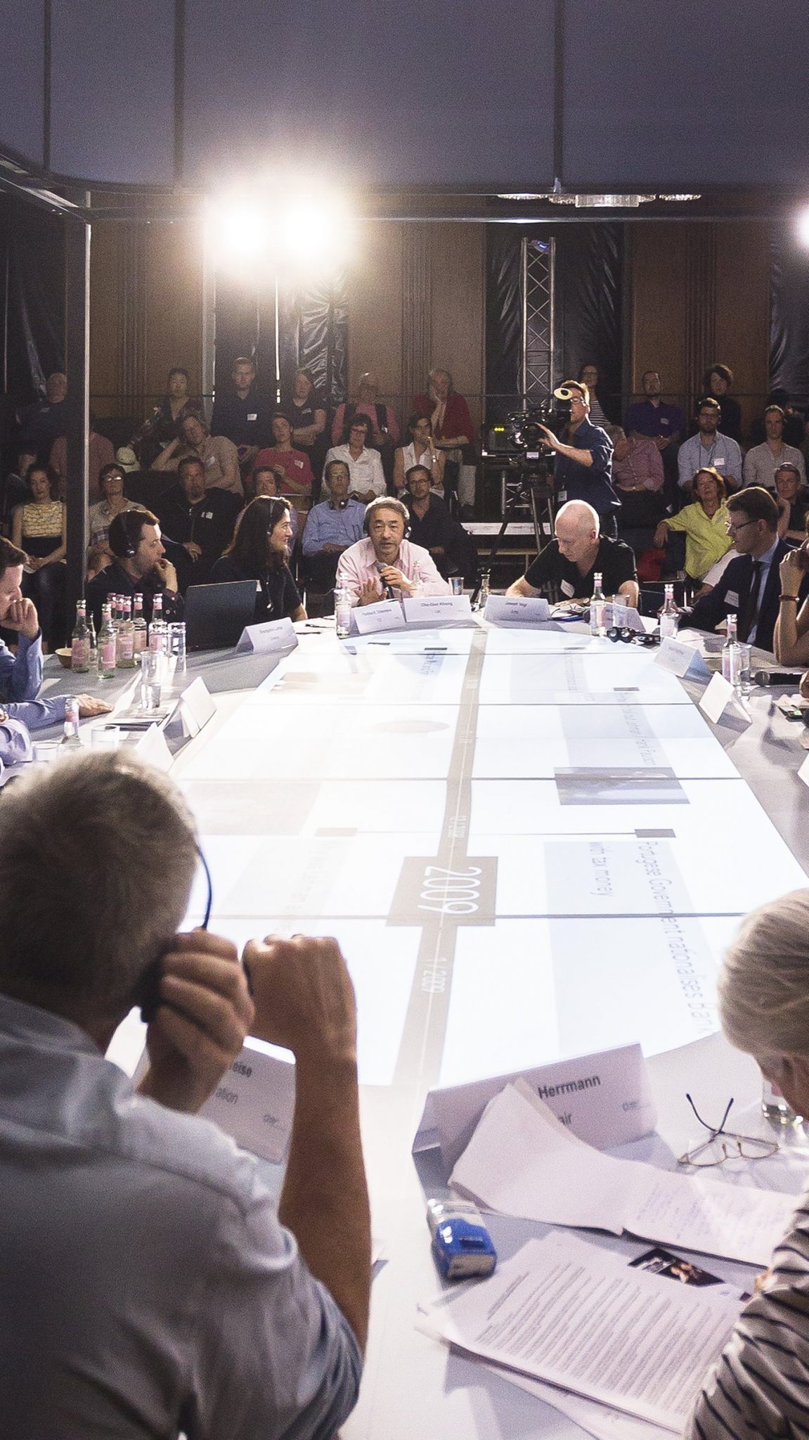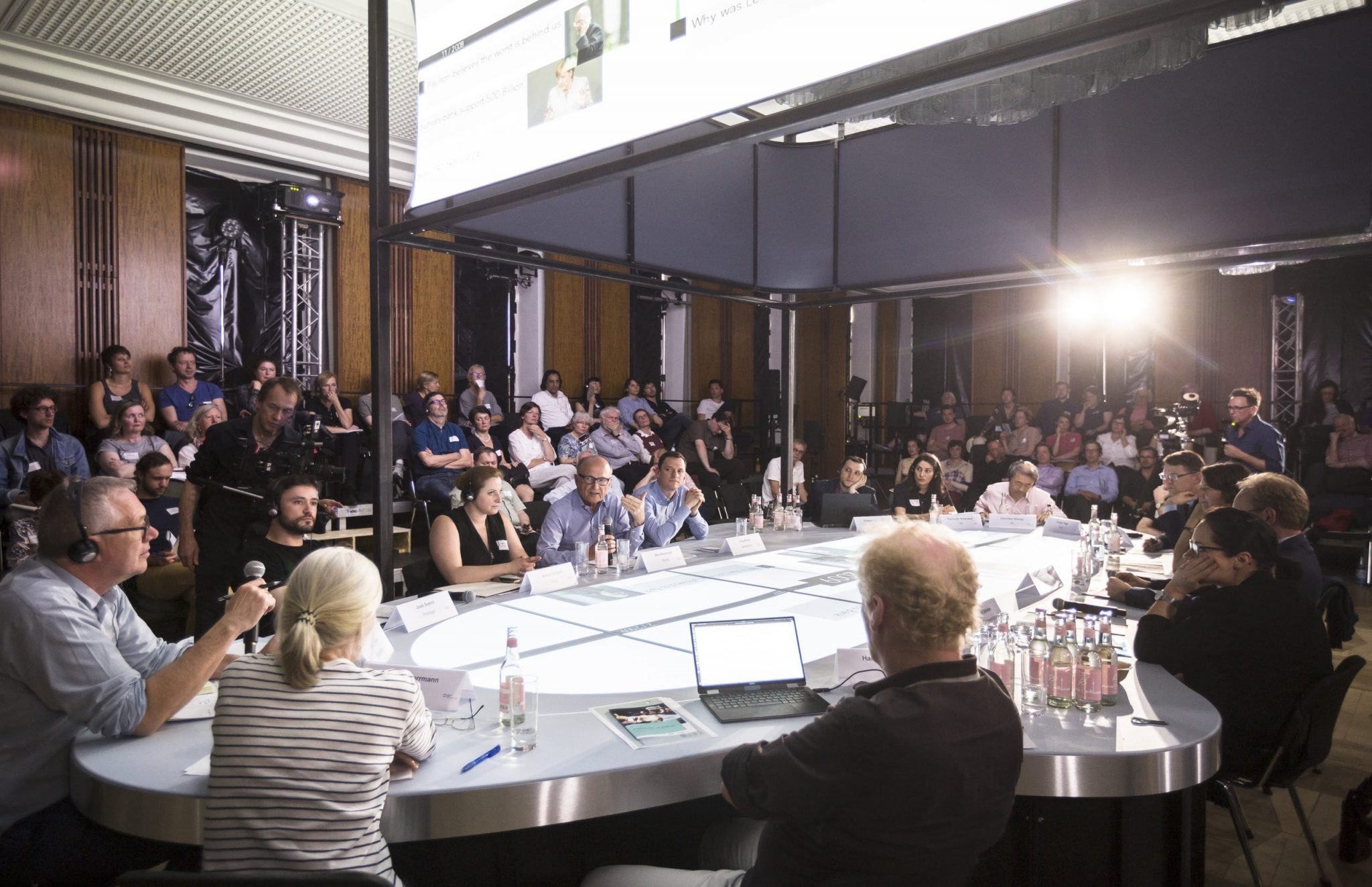 During the symposium "Which future?! Rethinking State" by Andres Veiel and Jutta Doberstein, interested citizens as well as representatives from culture, activism and science discussed new models of work, wages, governance and participation in 2018.