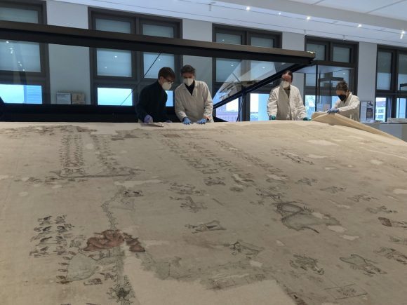 One of the most impressive objects of the Ethnologisches Museum has found a new home: the “Lienzo Seler II / Coixtlahuaca II” is displayed in a wide table display case. The approximately sixteen-square-metre cotton cloth (383 cm x 442 cm) dates from the sixteenth century. Mixtec, Nahuatl, and Cocho speakers produced the painted cloth with inscriptions in the Coixtlahuaca Valley, in what is now the Mexican state of Oaxaca. They recorded social events spanning a period of more than 500 years extending into the early Spanish colonial period after 1521, visualising their claim to power in the style of pre-Columbian pictorial manuscripts.