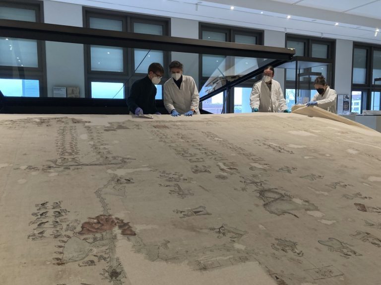The historic cloth, which had hung untouched in a glass display case in the Ethnologisches Museum in Berlin-Dahlem for almost fifty years, was restored in preparation for its transfer to the Humboldt Forum. To protect the light-sensitive fabric, the slightly angled table display case is equipped with a cover which opens at certain intervals to reveal the exhibit. The document is named after its collector, Eduard Seler, who brought it to Berlin in 1897. Later department director of the America collection at what was then the Völkerkundemuseum in Berlin, Seler studied the unknown characters in depth. In addition, the Lienzo bears the name of the main town and valley where it originated. With the colonization of Mesoamerica and the concomitant ban on hieroglyphic writing and destruction of most manuscripts and other written sources, knowledge of how to read the characters was lost. In 2017, the Lienzo was published in all its details for the first time and interpreted by ten international experts based on the latest scientific findings.