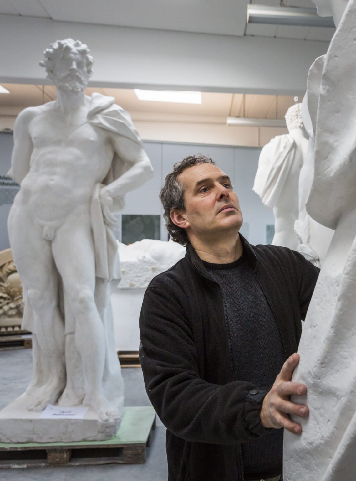 No less important than the artistic talent is the close study of the few original sculptural fragments that have survived. These are books about the history of the time for those who know how to read them. Marks on the surfaces provide clues as to the tools and techniques used: joint surfaces, leaded iron anchors and casting channels indicate how the sculptures were constructed and fixed. The sculptors working in today’s Palace Workshop look to the overall composition as well as the details of the surviving originals, such as the portrait reliefs of the Roman kings Romulus and Numa on Gate V in the Schlüter Courtyard. These pieces were preserved in their original condition and illustrate the virtuosity of Baroque artists in their handling of geometric rigour. As of 2019, these two pieces as well as ten of the surviving colossal sculptures will be on display in the Humboldt Forum’s Sculpture Hall.