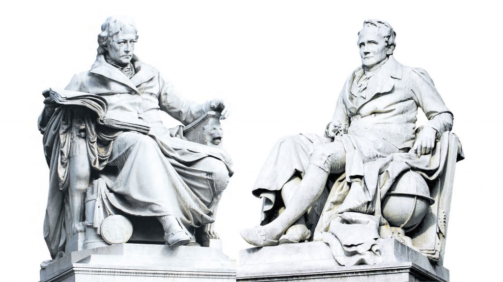 Image info Alexander und Wilhelm von Humboldt © bpk / Kupferstichkabinett, SMB / Dietmar Katz #Humboldt Brothers © bpk; bpk / Staatsbibliothek zu Berlin; bpk / Kupferstichkabinett, SMB / Dietmar Katz editorial Our two name-givers 4 2 min read The boat with oars on the shore near the american Indian settlements in the Delta of the Orinoco - Venezuela Boot am Ufer nahe der Siedlungen amerikanischer Indios am Delta des Orinoco in Venezuela © vadim_petrakov – stock.adobe.com guest Commentary Between idealization and criticism 6 min read Foyer Humboldt Forum © SHF / Photo: David von Becker background A name entails responsibility – How much Humboldt is in the Humboldt Forum? 6 7 min read Construction Site Open Day at the Humboldt Forum, 2018 © SHF / David von Becker guest Commentary Where can I find Humboldt? 1 3 min read Excerpt from Andrea Wulf's graphic novel „The Adventures of Alexander von Humboldt“ © Random House Interview “We protect the things we love” 1 5 min read Medal at Alexander von Humboldt's Cosmos Lectures. This silver coin is from 1828 and was designed by the medal designer Henri-François Brandt. The obverse shows Alexander von Humboldt, the reverse is an allegory of the Cosmos. © bpk / Münzkabinett, SMB / Reinhard Saczewski Humboldt’s Cosmos – Our World 4 min read Statue of Wilhelm von Humboldt in front of the Humboldt University © Sebastian Thiele, (CC BY-NC-SA 2.0) guest Commentary By Humboldt’s Feet 3 7 min read Tegel Palace - View to the corner towers with the wind reliefs Since 1766 owned by the Humboldt family, photo by Hedda Walther, 1936 © bpk / Photo: Hedda Walther speech A thoroughly modern past 1 15 min read 12»