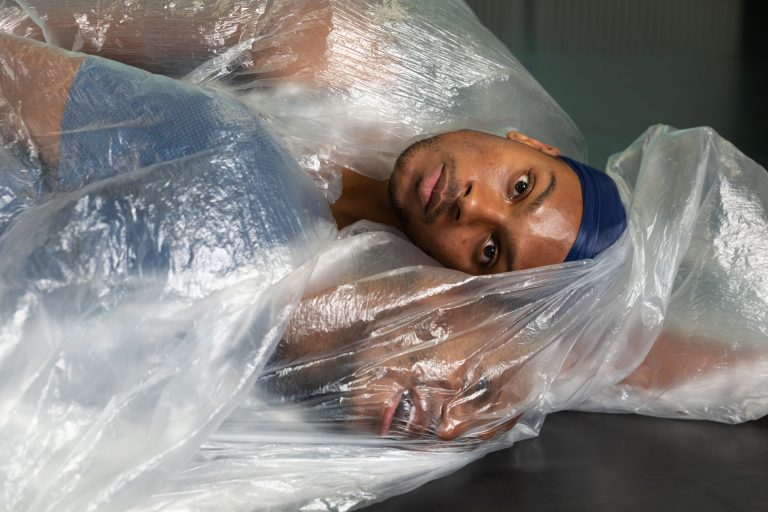 Fotografien von eine Probe zu "Mexico Aura. Mythen von Besitz und Besessenheit", im Bild: Jakevis Thomason (o.) und Mani Obeya (u.)