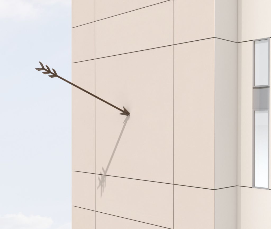 Südpfeil (Southern Arrow), a bronze arrow of almost four metres in length piercing the northern facade of the Humboldt Forum, is an intervention by the award-winning Berlin architect and artist Jürgen Mayer H. that immediately catches the eye and raises questions. Inspired by the phenomenon of “arrow storks” – migratory birds with African arrows in their plumage who provided the first ever visible evidence of avian migration paths around the world – Südpfeil addresses cultural and colonial points of reference while adding a distinctive note to the facade. In explaining its decision, the jury commented: “This work is special not just for its abundance of significance, its ambivalent approach, its ambiguity, and its accessibility, but also because it can be reinterpreted at multiple levels, symbolizing a welcoming gesture as much as it does a pugnacious threat.”