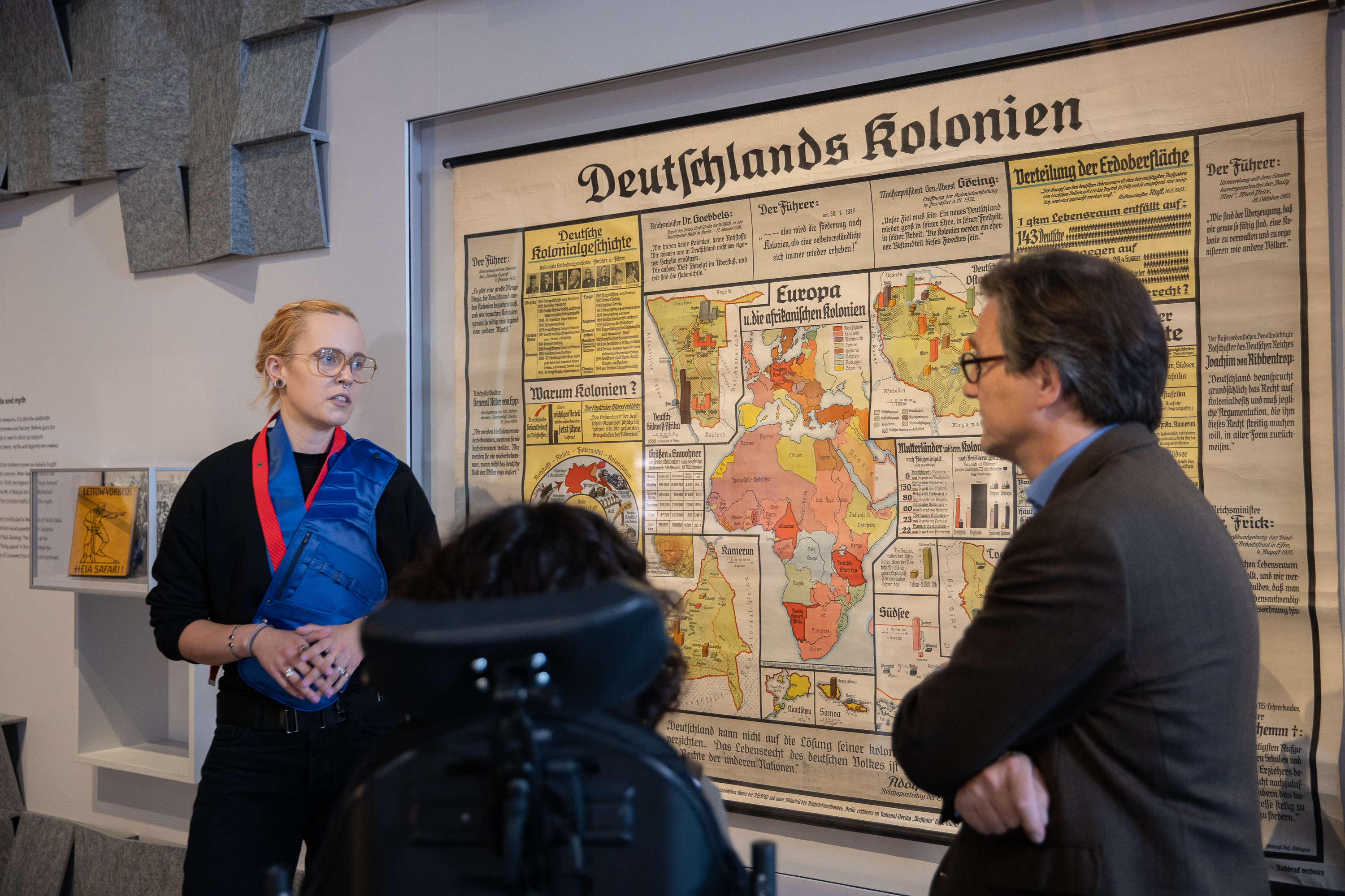 A schoolroom map entitled Germany’s Colonies hangs in the War room of the BERLIN GLOBAL exhibition. Here, the National Socialist leadership demands the reclaiming of the former German colonial territories. Josephine Apraku, scholar of African studies and expert in anti-discrimination education, joins us to examine this map to better understand what it reveals: What was the image of Africa conveyed to young white Germans of this time? What can we learn about German Colonialism under National Socialism? As part of the discussion, Apraku provides insights into how and where colonialism is remembered in Berlin and draws connections to the present.