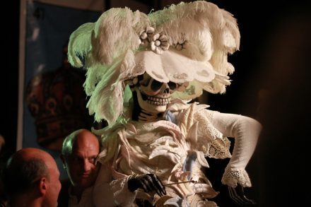 Catrina is THE figure that stands for the Mexican Festival of the Dead and that every child in Mexico knows: an elegant lady with a sweeping hat and feather boa as a skeleton, created by the Mexican lithographer José Guadalupe Posada. Catrina appears, walks through the room, takes a closer look at one or the other, visits the ofrenda and asks chosen ones to dance. She is accompanied on her way by live music.
