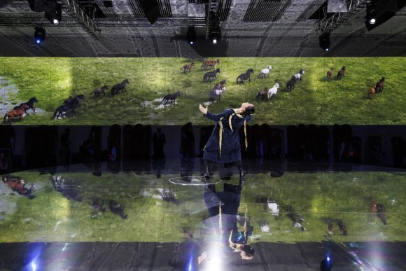 A Chinese scroll painting like a scene from an action movie: a horseman shoots a warrior galloping in front of him with bow and arrow. The transcultural Paper Tiger Theater (Berlin – Beijing) has been inspired by the scroll painting Machang Lays Low the Enemy Ranks in the collection of the Museum für Asiatische Kunst. In their dance-video-installation-performance the artists span an arc from the Chinese imperial wars and their celebration in the imperial palace to the colonial loot of Beijing in the so-called Boxer War in 1900 to the China of today. Five dancers and actors meet a contemporary witness of communist party General Secretary Honecker’s China trip, a skateboarder meets a percussionist, video art meets costumes for everyone.