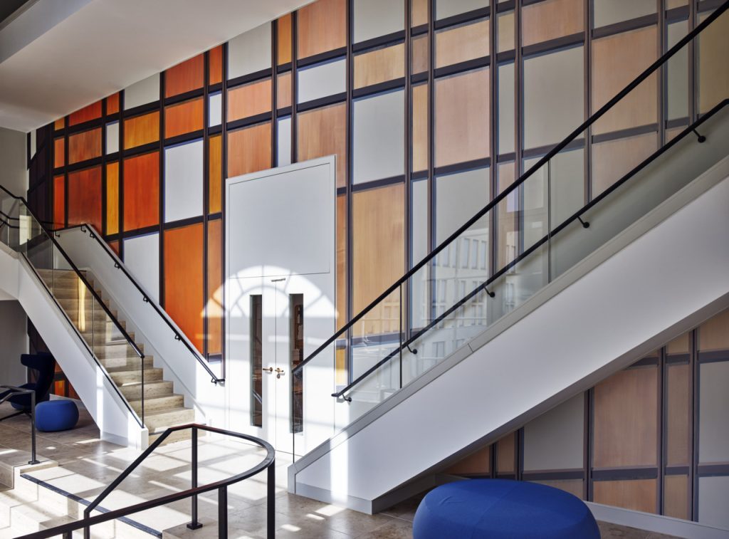Nothing lasts forever: after having been closed in 1990, the Palace of the Republic was demolished between 2006 and 2008. A few years and an interim use later, the Humboldt Forum was built on the same site. But though gone from the urban space, the Palace of the Republic, which had served as the seat of the GDR Volkskammer, or People’s Chamber, and as a cultural centre from the mid-1970s, leaves its mark on this new building on a historic site: specifically in a large-scale wall painting in the stairwell above Portal 5 of the Humboldt Forum. At this location, the Berlin-based artist Tim Trantenroth gives centre stage, like an echo, to the facade of the GDR Palace with its bronze-mirrored windows. His mural spans the entire portal wall, creating a compact spatial impression. Including almost 200 different shades of colour, the abstract grid evokes the architectural shell of the GDR building. For this artwork, which reflects on loss, memory and dealing with history, Trantenroth was awarded first place in one of the competitions for the seven Art in Architecture locations in the Humboldt Forum. Having conceived the work as a provocation or joke, he was all the more stunned when he won the competition.